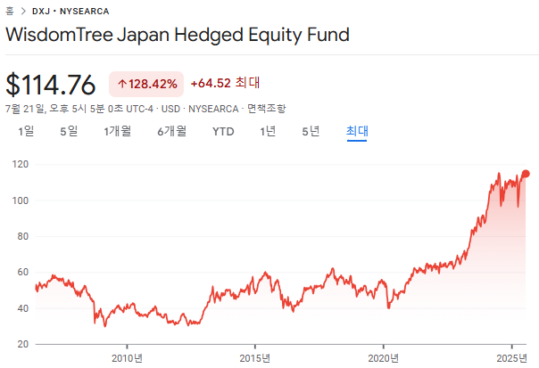- 특히 엔화 약세(엔저)가 지속될 것으로 예상될 때, 같은 일본 주식 ETF(예: EWJ)보다 달러 기준 수익률이 크게 높게 유지되는 경향이 있어 환 헤지 효과가 강력하게 드러납니다.