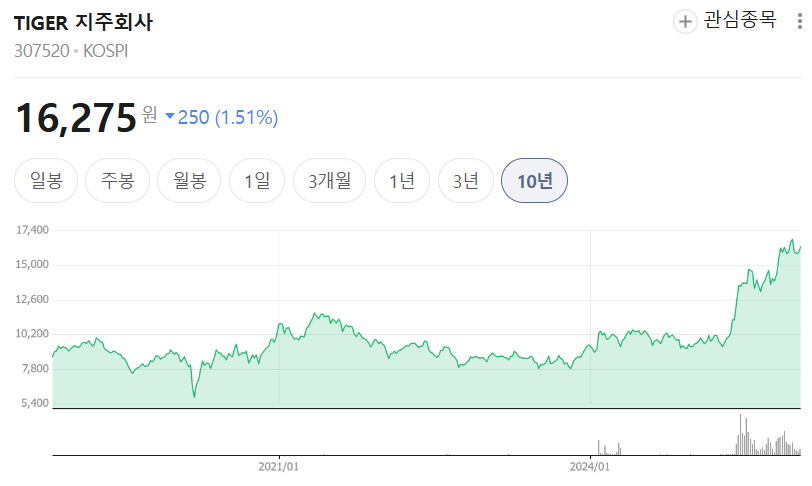 **TIGER 지주회사 ETF(307520)**는 미래에셋자산운용이 운용하는 국내 상장 지주회사 전용 ETF로, 국내 주요 지주회사에 분산 투자할 수 있는 국내 유일의 상품입니다.